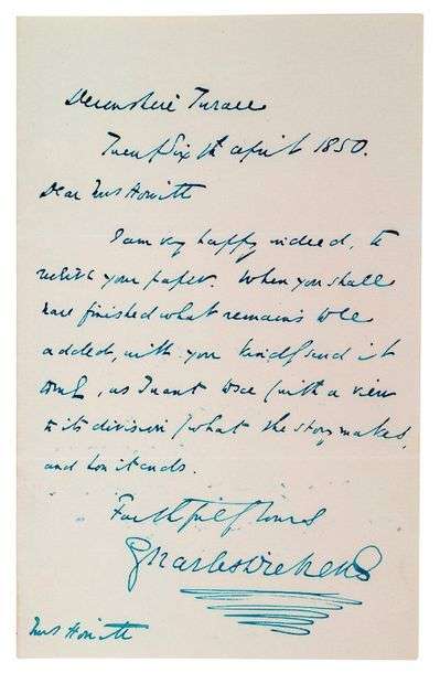 L.A.S. à Mrs Horwitt. (Londres), Devonshire Terrace, 26 avril 1850. 1 pp. in-8| en anglais.