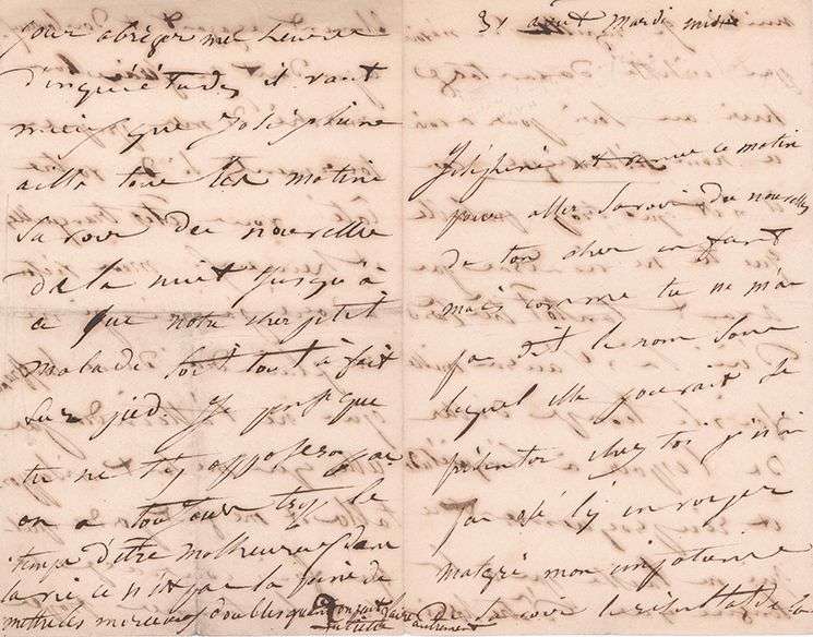 Lettre passionnée de la maitresse de l'écrivain, s'inquiétant de la santé d'un de ses enfants. Joséphine est venue ce matin pour aller savoir des nouvelles de ton cher enfant, mais comme tu ne m'as pas dit le nom sous lequel elle pourrait se présenter chez toi, je n'ai pas osé l'y envoyer, malgré mon impatience de savoir le résultat de la nuit. Je regrette de n'avoir pas insisté davantage hier au soir pour avoir ce nom sésamique car il n'est que trop probable que tu ne viendras pas avant tantôt très tard. D'ici là, j'aurai mille fois le temps d'aller de l'espoir à l'inquiétude et réciproquement, ce qui ne laisse pas à la longue que d'être horriblement agaçant et douloureux. Cependant je ferai bon marché de mes propres tourments si de votre côté vous êtes tranquilles et heureux. Mon Victor adoré, jamais je ne me plaindrai d'une souffrance qui ne t'atteindra pas. Celles qui me sont insupportables et me font perdre quelque fois courage, ce sont les tienne propres (...). Elle enverra tous les matins Joséphine pour avoir des nouvelles de notre cher petit malade jusqu'à ce qu'il soit remis sur pied. Je pense que tu ne t'y opposeras pas. On a toujours trop temps d'être malheureux dans la vie (...)
