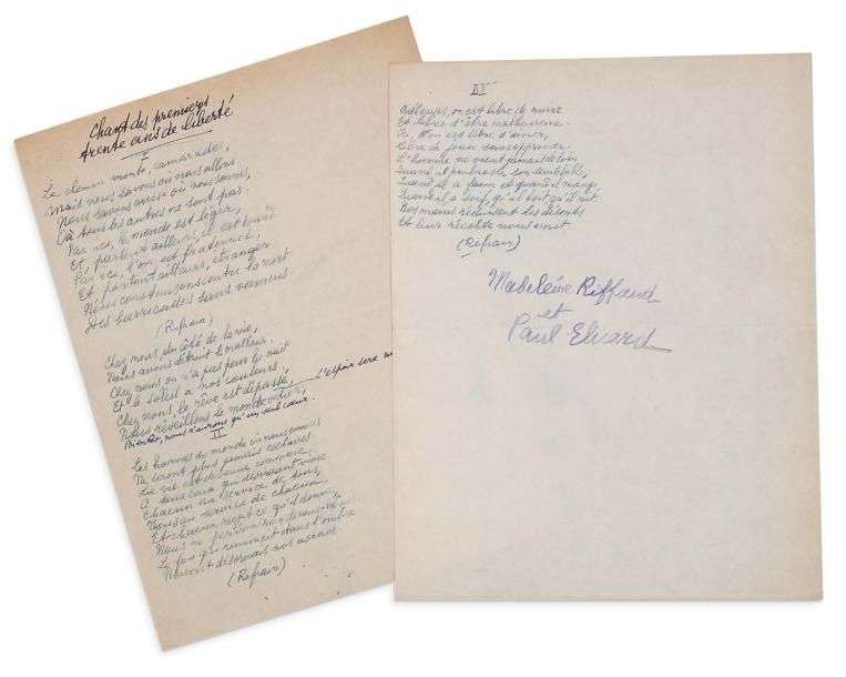 Poème sur la liberté et la paix au crayon bleu avec corrections, additions à l'encre bleue, célébrant les trente ans de la Révolution d'Octobre, publié dans l'Humanité du 6 novembre 1947. (...) Le chemin monte, camarades/mais nous savon où nous allons/nous savons aussi où nous sommes/où tous les autres ne sont pas/ne seront plus jamais esclaves/la vie est devenue commune/à tous ceux qui désiraient vivre chacun au service de tous/tous au service de chacun/ailleurs on est libre de nuire/et libre d'être malheureux/ici on est libre d'aimer/libre de jouir sans opprimer (...). Ce poème de trente-huit vers avait été composé conjointement avec la grande résistante communiste Madeleine Riffaud