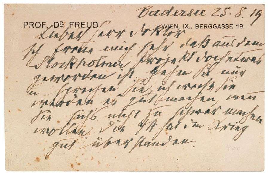 C.A.S. «Dr Freud». Badersee, 25 août 1919. 2 pp. in-12 oblong, en-tête du «Prof. Dr Freud» à son adresse à Vienne| en allemand.