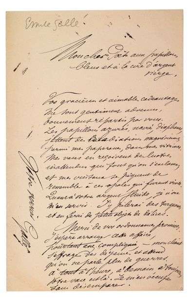 L.A.S. à son «cher Poète aux papillons bleus et à la cire d'argent vierge». S.l.n.d. 1 pp. bi-feuillet in-8.
