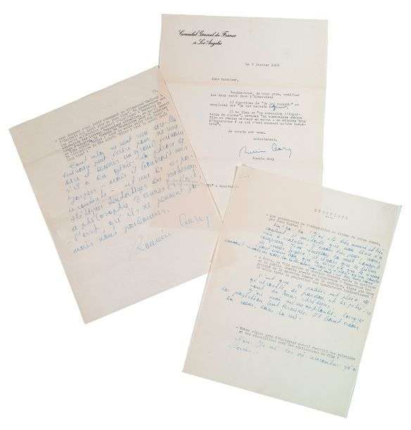 L.S. à Eric Le Guebe, et tapuscrit signé en partie aut. Los Angeles, 9 janvier 1959. 1 pp. in-4 avec en-tête en coins du Consulat général à Los Angelès| & 2 ff. in-4, les questions dactylographiées, les réponses de Gary manuscrites à l'encre bleue.