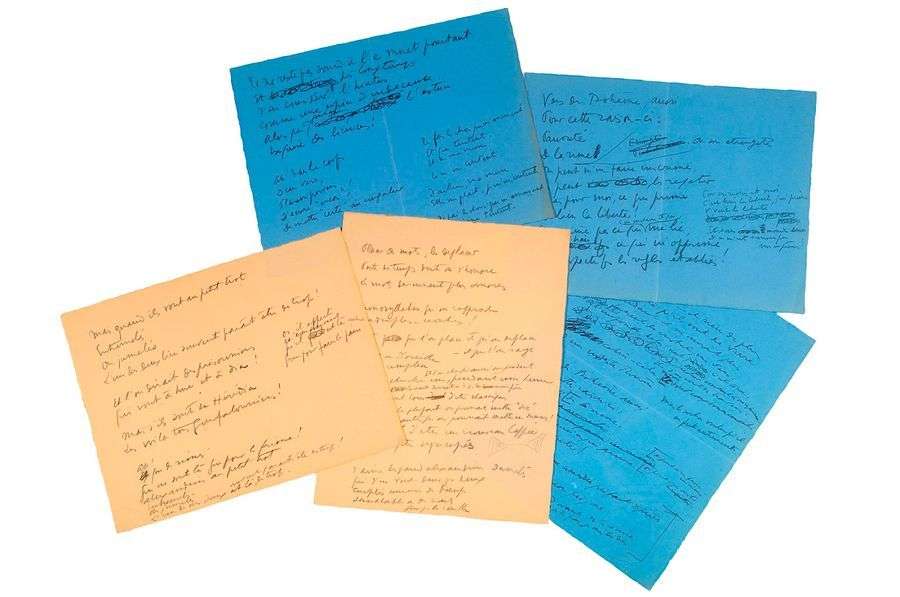 Manuscrit aut. S.l.n.d. 3 ff. sur papier bleu et 2 ff. sur papier jaune, au crayon| nbses ratures et corrections.