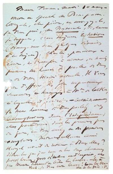 L.A.S. «V.» à Emile Deschanel, à Bruxelles. Marine Terrace, mardi 10 mars (avril 1855). 1 pp. in-8, adresse au verso, marques postales.