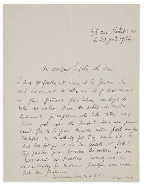 L.A.S. à l'abbé ***. Paris, 23 juin 1934. 1 pp. in-4.