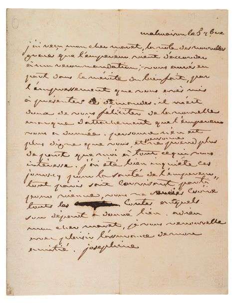 Lettre de l'Impératrice au moment où Maret était fait duc de Bassano, et évoquant la santé de Napoléon dont elle s'inquiète. J'ai reçu, mon cher Maret, la note des nouvelles grâces que l'Empereur vient d'accorder à ma recommandation| vous avez eu part dans le mérite du bienfait, par l'empressement que vous avez mis à présenter ces demandes. Il m'est doux de vous féliciter de la nouvelle marque d'attachement que l'Empereur vous a donné (...). Elle poursuit: J'ai été bien inquiète ces jours-cy pour la santé de l'Empereur. Tout Paris sait Corvisart parti pour Vienne. Vous ne sauriez croire tous les contes auxquels sont départ a donné lieu (...)
