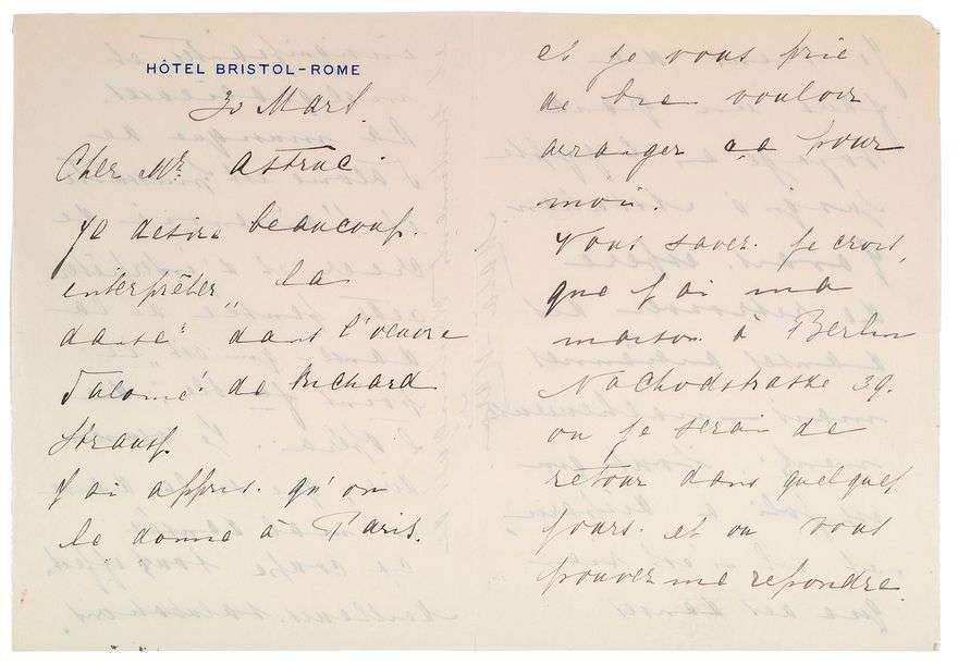 Elle souhaite interpréter «la danse» de Salomé dans l'opéra de Richard Strauss| (...) j'ai appris qu'on le donne à Paris, et je vous prie de bien vouloir arranger ça pour moi. Vous savez, je crois, que j'ai ma maison à Berlin, Nachodstrasse 39, où je serai de rettour dans quelques jours et où vous pouvez me répondre. Elle vient de faire un grand voyage en Egypte jusqu'à Assouan. J'avais espéré de retrouver des danses anciennes, mais - malheureusement tout [ce] qui est joli a disparu et il n'est rien que des danses insignifiantes et malgracieuses. La musique de Salomé est puissante et j'ai envie de créer et d'interpréter cette pensée de la danse qui «le point faible» de l'opéra. Je veux dire que si la danse est mal dansée, ça coupe tout effet (...)