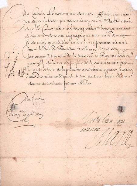 L.S. avec compliments aut. «Vostre bien bone cousine Marie» à la duchesse de Bouillon. Angoulême, 13 mai 1619. 1 pp. in-folio, adresse au verso, 2 petits cachets de cire rouge armorié, sur lac de soie| petite mouillure claire au pli.