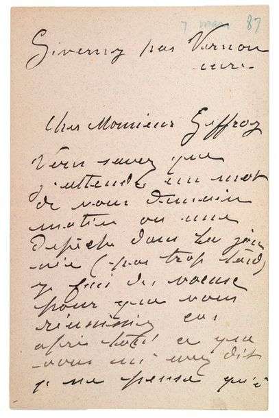 L.A.S. à Geffroy. Giverny par Vernon, 7 mars 1887. 2 ff. bi-feuillet in-12| joint son enveloppe.