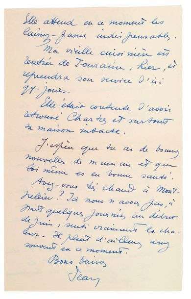 Donnant de ses nouvelles un mois après sa première arrestation par les Allemands le 17 juin| nommé préfet de Chartres, Jean Moulin avait refusé de signer un acte de condamnation contre des tirailleurs sénégalais faussement accusés de méfaits sur la population civile. J'espère que tu reçois maintenant mes lettres aussi bien que je reçois les tiennes. Nous avons ici, depuis deux ou trois jours, l'infirmière-chef de la Somme, en passage à Chartres, en auto| elle aimerait bien retourner à Amiens, mais pour l'instant, il semble que se soit interdit. Aussi retournera-t-elle sans doute à Saint-Lô où la préfecture de la Somme est repliée. Elle attend en ce moment les laissez-passer indispensables. Sa «vieille cuisinière» est de retour et reprendra son service| elle était contente d'avoir retrouvé Chartres et surtout sa maison intacte. J'espère que tu as de bonnes nouvelles de maman et que toi-même es en bonne santé. Avez-vous très chaud à Montpellier ? (...)