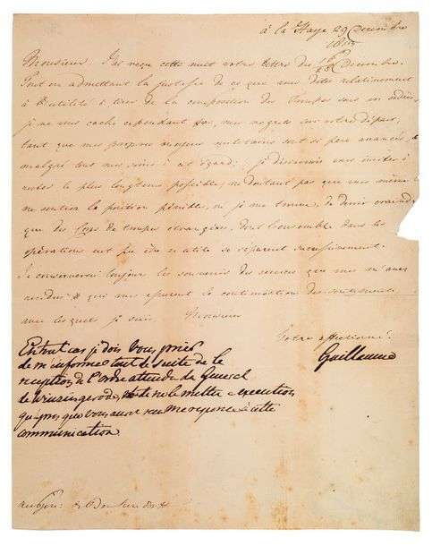 L.S. avec apostille aut. au général Benkendorff. A La Haye, 29 décembre 1813. 1 pp. in-4.