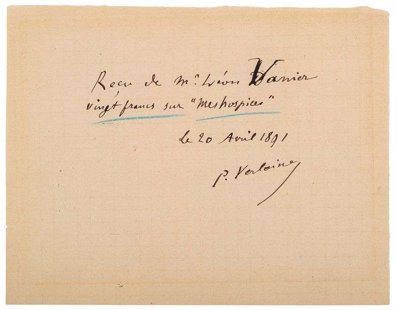 Reçu de M. Léon Vanier vingt francs sur «mes hospices»