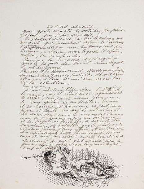 Beau texte sur l'art abstrait illustré d'un dessin. Ce texte a été composé à la demande de Michel Sima pour un ouvrage en préparation. Avec quelle voracité les artistes se précipitent sur l'Art abstrait!! Ils veulent trouver, par lui, le calme rassurant, que poursuit depuis les cavernes l'ange déchu qui se souvient des cieux, calme avec lequel il espère, enfin, se confondre. Comme la mouche, il s'est cogné à tous les points du bocal dans lequel il est enfermé. Primitifs, Renaissants, Classiques, Impressionnistes, Fauves, Cubistes, etc ont cru chacun à leur manière avoir trouvé la solution. En vain. L'art abstrait l'apporte- ra-t-il? Il le croit, car il croit avoir abandonné le sujet, rendant ainsi plus pure la conception de ses fidèles. Mais il se trompe| l'homme ne peut pas se fuir et seuls les sujets ont changé. Ils sont toujours à la mesure de l'homme mais de l'homme aidé du microscope et ses sujets ne sont plus des divinités, des donateurs, des batailles, que la photo ou le cinéma peuvent leur offrir à l'infini, mais des infiniment petits, précis, vagues, boueux, savants, naïfs, gais, colorés, morcelés, combinés, etc. Le champ des sujets s'est agrandi, depuis la femme nue, mais il y a toujours sujet. Tout est sujet (...). Au bas de la feuille, dessin original à la plume (environ 7 x 15 cm): nu allongé