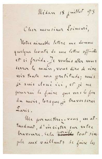 Remerciements du soutien de Poincaré à l'occasion de l'attribution de la Légion d'honneur à Zola. Votre aimable lettre me donne quelque honte de ma lettre officielle et si froide. Je voulais allez vous serrer la main, vous dire de vive voix toute ma gratitude| mais je suis cloué ici, et je ne pourrai le faire que vers la fin du mois, lorsque je traverserai Paris (...). Zola loue sa bravoure| Cela parait tout simple aux vaillants de faire les choses qui leur semblent justes. Je n'en sais pas moins ce qu'il fallait de tranquille courage pour me donner un témoignage officiel de haute sympathie| et certains journaux vous le feront bien voir (...)
