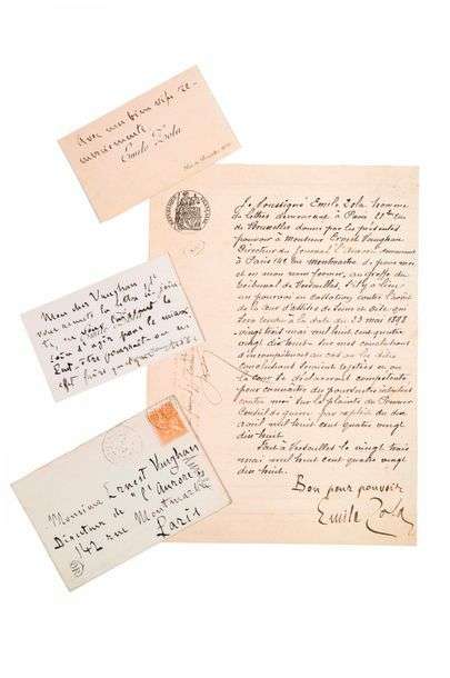 - une carte de visite annotée par Zola, à Vaughan (avec enveloppe), lui remettant une lettre demandant d'agir pour le mieux.