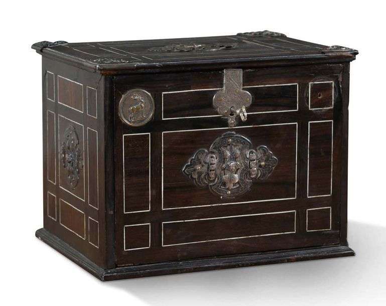 CABINET MINIATURE en placage de bois noirci, bois de violette et encadrements de filets d'os. Entrée de serrure et écoinçons en métal ciselé argenté. Il ouvre par un petit vantail découvrant cinq tiroirs.