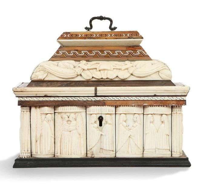 COFFRET de forme rectangulaire à âme en bois avec plaquettes d'os sculpté en bas-relief et marqueterie à la certosina. Représentation d'un couple face à face sur les plaquettes les plus larges et d'un homme adossé à des cyprès sur les plus étroites, colonnes cannelées aux angles| couvercle à gradins avec angelots tenant un écu et poignée sommitale.