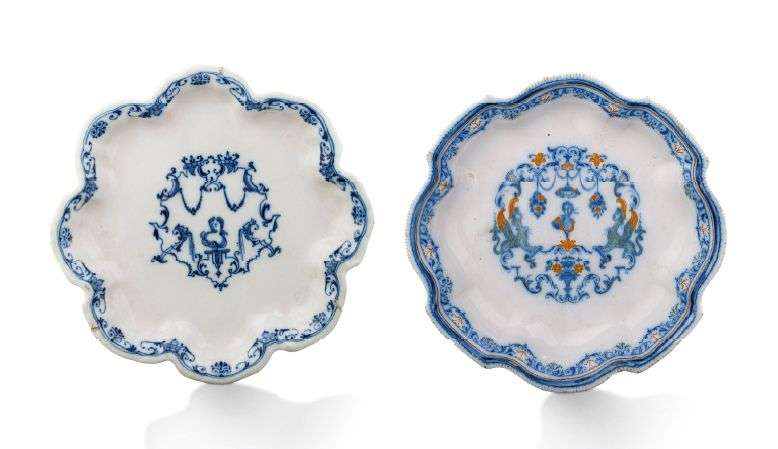 DEUX FAÏENCES MOUSTIERS fabrique d'OLERYS Drageoir à contours, décoré en c