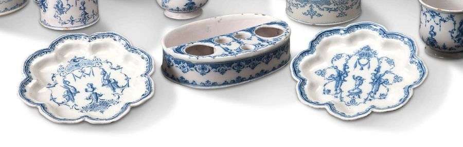 Paire de drageoirs largement festonnés, décorés en camaïeu bleu au centre d'une composition «A la Bérain», avec buste de sphinges, lambrequins et ferronneries, une fine dentelle sur l'aile.