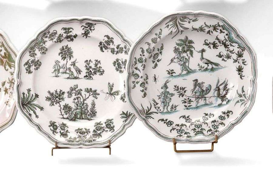 Paire d'assiettes inscrites dans un octogone, légérement festonné, décorées en camaïeu vert de nombreux grotesques, terrasses fleuries, insectes, grands oiseaux.