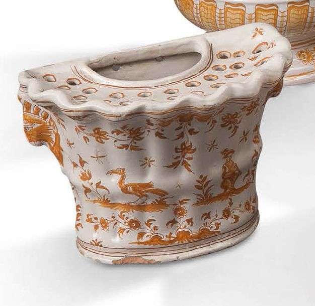 Bouquetière godronnée, décorée en camaïeu jaune, de grotesques, oiseaux, terrasses fleuries