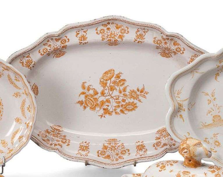 Grand plat ovale à bord contourné décoré en camaïeu ocre sur l'aile et au centre de bouquets de solanées.