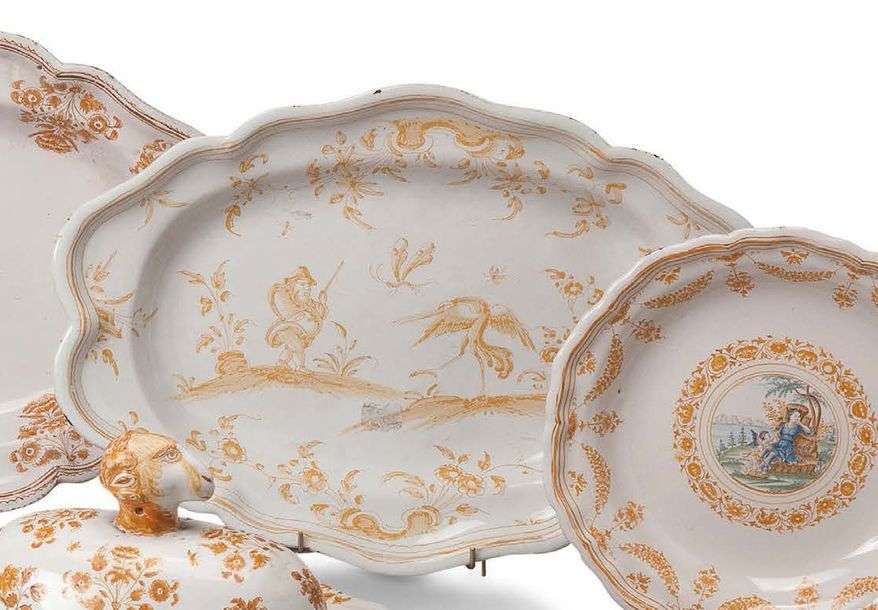 Grand plat ovale décoré en camaïeu ocre à décor de personnages et volatiles.
