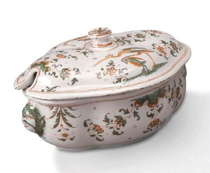 Sucrier oblong à larges mouvements, décoré en vert et jaune de grands grotesques sur les deux faces du couvercle.