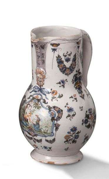 Pichet décoré en polychromie d'une large scène mythologique inscrite dans un important cartouche à guirlandes se terminant sous le bec verseur par un grand noeud de ruban bleu