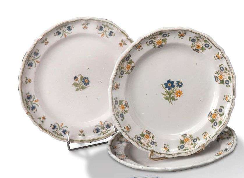 Trois assiettes rondes légèrement contournées, décorée en polychromie au centre et sur l'aile de composition de fleurs de solanées