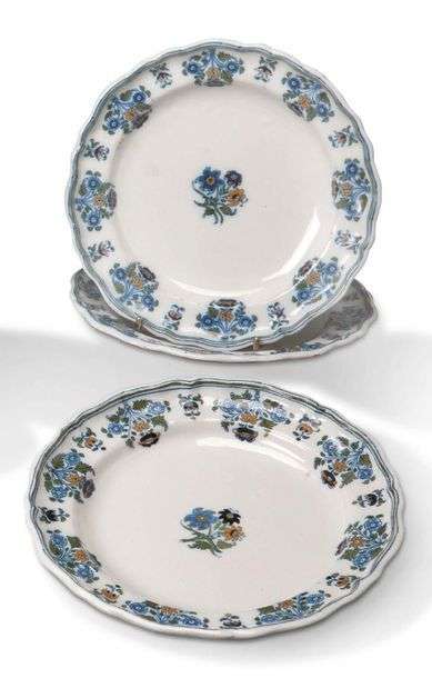 Trois assiettes légèrement contournées, décorées en polychromie, de bouquets de solanées au centre et sur l'aile débordant sur le marli, à dominante bleue.