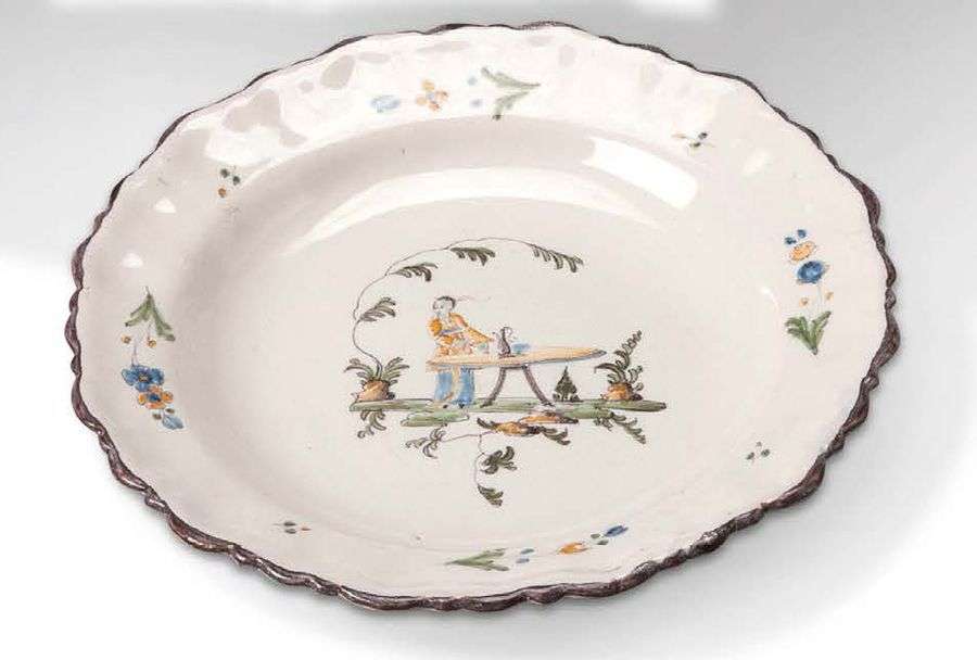 Assiette légèrement contournée décorée en polychromie au centre scène animée d'un chinois devant une table servie, sur un tertre fleuri.
