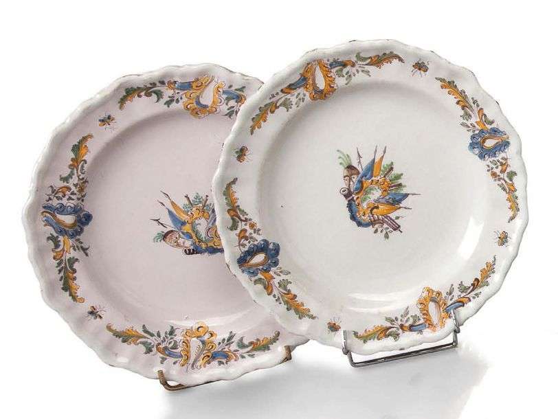 Paire d'assiettes en faience décorées en polychromie «Au Drapeau» au centre d'un important trophée, sur l'aile de quatre cartouches et de quatre petits insectes