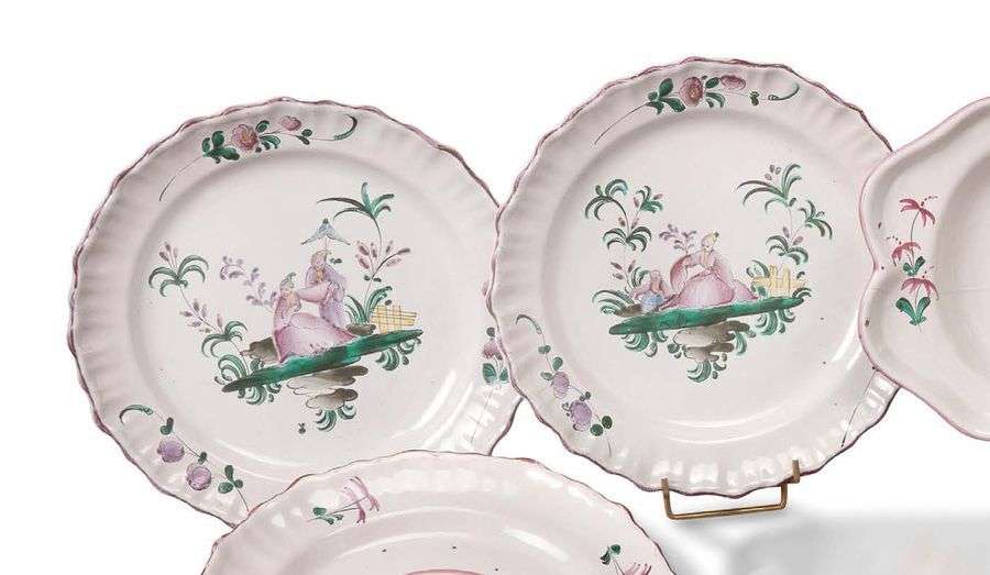Paire d'assiettes rondes très peu contournées, décorée en polychromie, au centre d'une composition animée «à la Marquise», sur l'aile, un filet carminé.