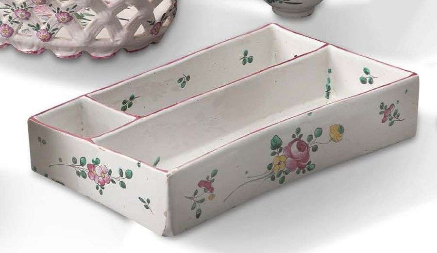 Plumier rectangulaire décoré en polychromie de diverses compositions fleuries, à l'intérieur et à l'extérieur.