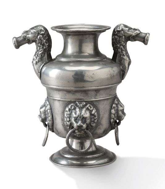ELÉGANT ET RARE VASE de forme balustre sur piédouche en étain ciselé à deux déversoirs latéraux à têtes de lion tenant dans leur gueule un beaupré.