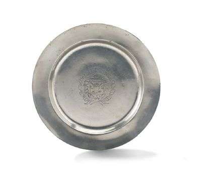 ASSIETTE en étain ciselée au centre d'un motif de coeur chiffrée LS et entourée d'une couronne de feuillages.