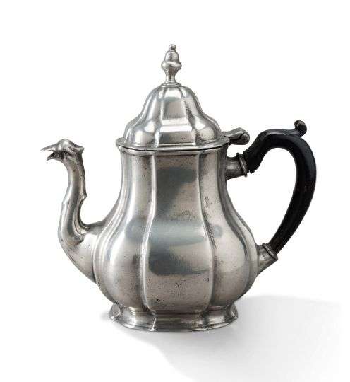 THÉIÈRE en étain à panse godronée et bec verseur formé d'une tête d'oiseau