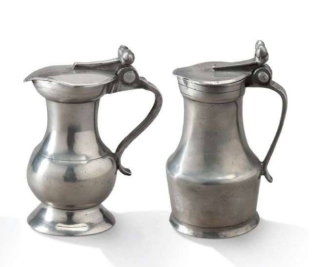 DEUX PICHETS Petit pichet en étain de forme balustre reposant sur un piédouche. Poucier à glands.