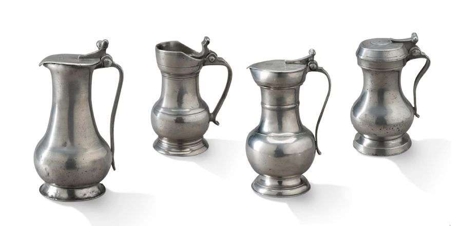 RÉUNION DE QUATRE PICHETS Pichet en étain à épaulement, poucier