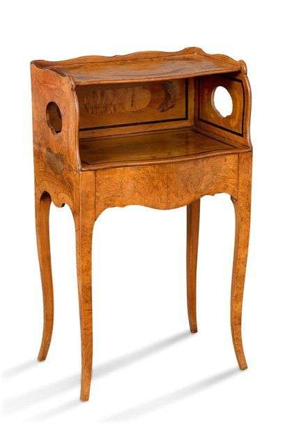 Table à en-cas Louis XV à deux plateaux en placage de merisier, frêne et ronce de frêne, marquetée de loupe d'amboine et rehaussée de filets de racine de bruyère incrustés. Le décor toutes faces se compose de motifs géométriques formés de croissants et réserves.