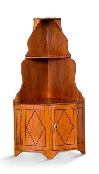 Petite encoignure en bois fruitier. Elle présente deux casiers séparés par un tablette arrondie et ouvre en partie inférieure par deux vantaux à décor de filets de bois noirci à motifs de losanges dans des réserves.