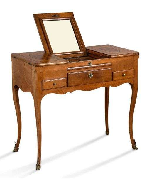 Table de toilette en noyer blond et placage de loupe de noyer.