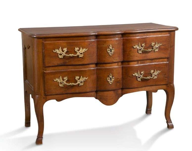 Importante commode arbalète en noyer mouluré ouvrant en façade par deux tiroirs séparés par une traverse. Les montants arrondis reposent sur des pieds cambrés terminés par des sabots.