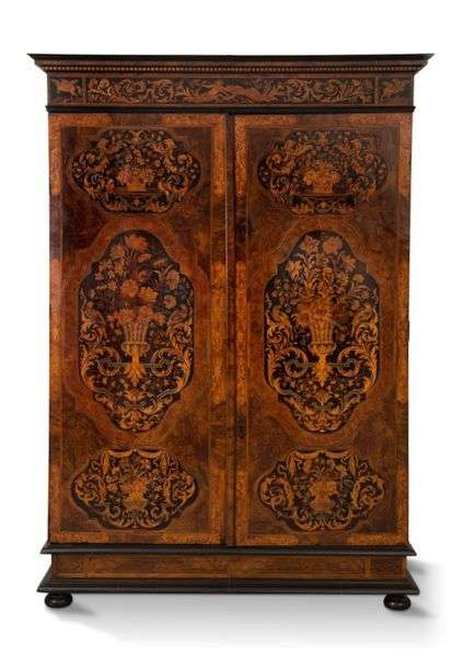 Armoire en placage de noyer ouvrant à deux portes ornées dans trois réserves mouvementées en marqueterie de bois fruitier et scagliola bleue de vases et paniers fleuris, volutes d'acanthes, draperies et oiseaux. Cotés ornés de rinceaux sur fond clair. Corniche à denticules, à bandeau marqueté de Pégase, hommes sauvages et volutes de feuillages.