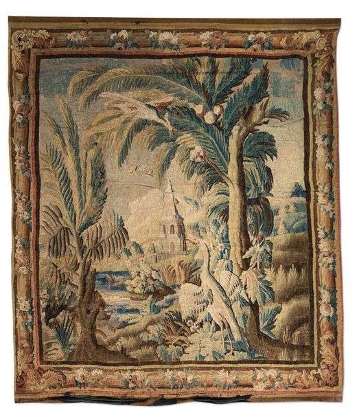 Tapisserie figurant une verdure avec au premier plan, un héron, en fond, une architecture de château.
