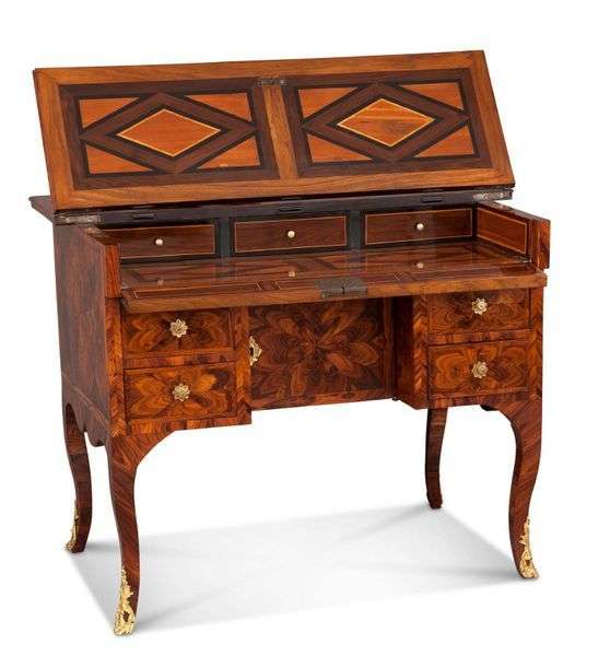 BUREAU DE CHANGEUR en bois de violette marqueté «en semelles » à décor de rosaces. Le plateau brisé et un tiroir simulé, à façade abattante, découvrent trois tiroirs. Façade à quatre tiroirs en caissons, autour d'un ventail, en retrait.