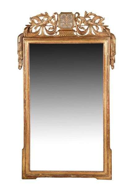 MIROIR en bois et stuc mouluré sculpté doré et argenté de forme rectangulaire orné d'un fronton ajouré d'une guirlande de fleurs et feuillages au centre desquels on trouve deux volatiles affrontés. Il est flanqué de draperies.