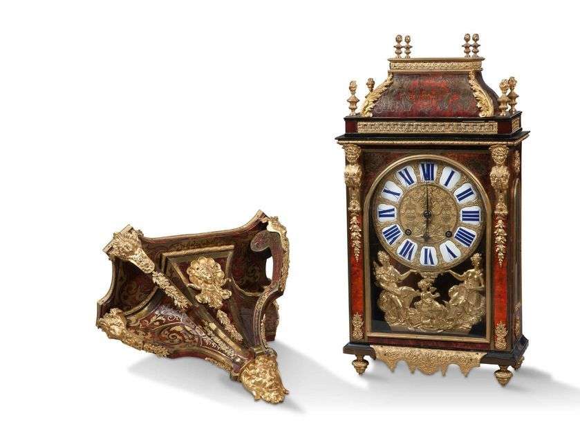 CARTEL ET SA CONSOLE D'APPLIQUE en marqueterie Boulle de laiton et écaille orné de motifs de bronzes ciselés et dorés du bustes, masques, acanthes et urnes flammées.
