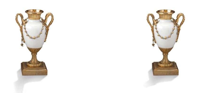 PAIRE DE VASES DE FORME BALUSTRE en porcelaine blanche et monture en bronze ciselé et doré. Les anses sont en forme de rinceaux d'acanthes retenant une chaîne boule. La base ronde à piédouche, ornée de feuilles de laurier et de raies de coeur repose sur un socle carré orné d'un rang de perles Fin de l'époque Louis XVI H: 42 cm| L: 17 cm